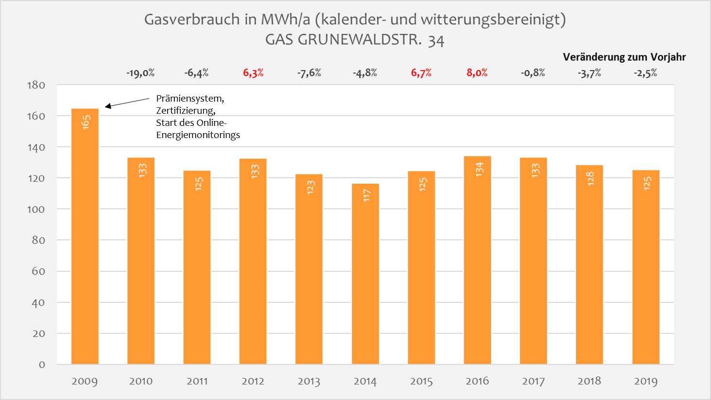 Wärmeverbrauch in der Liegenschaft Grunewaldstraße 34 von 2003 bis 2019