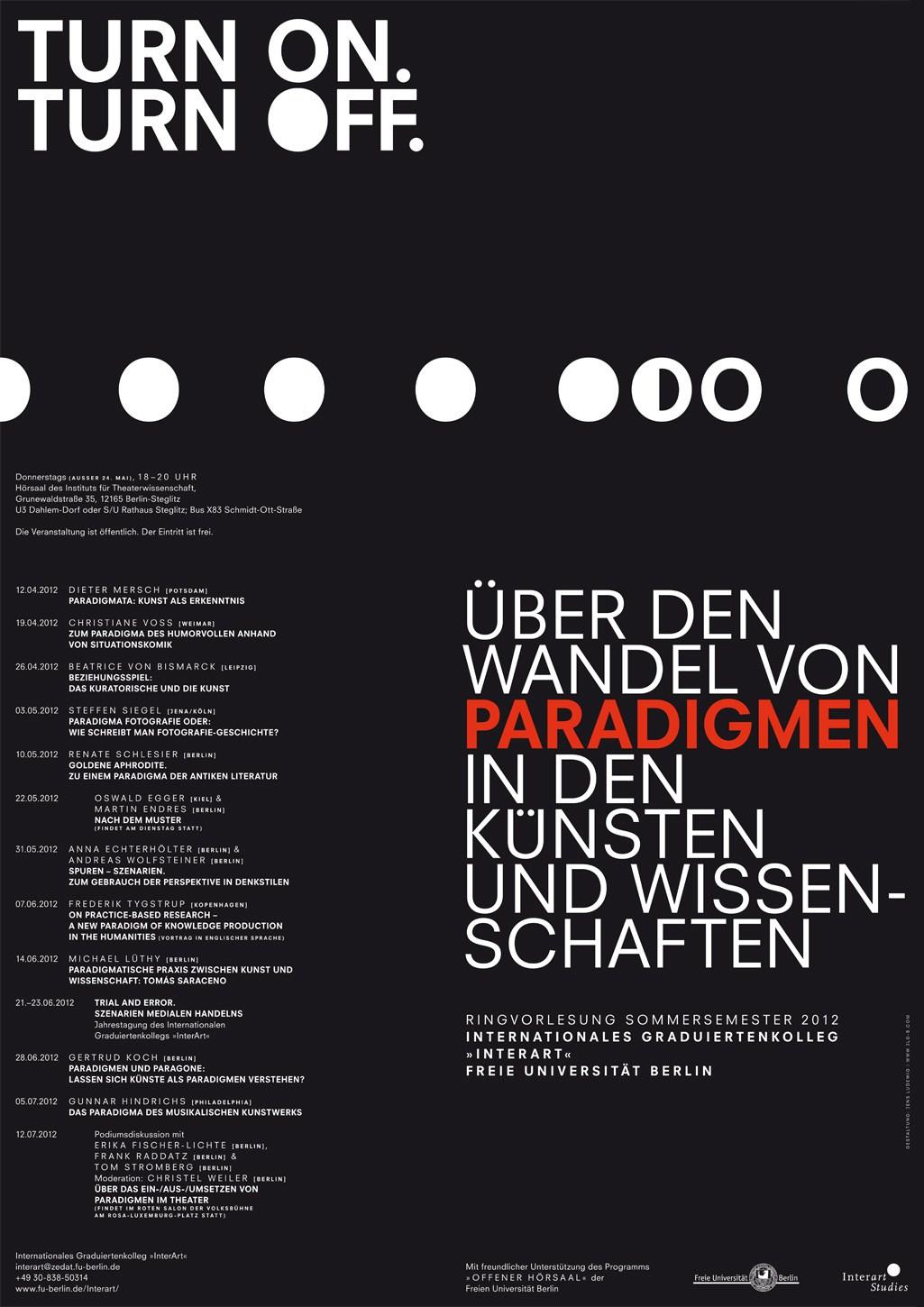 During the last 60 years, fundamental changes of paradigms have taken place in political, social and technological contexts. In the course of these changes, academia and knowledge culture have fundamentally been transformed, too. Especially in the arts and the art-linked sciences, one turn is followed by another: abstract, concrete, performative or spatial, interactive or multimedia – paradigmatic demarcations are formed and unformed every time anew. The art theories created in order to explain new art phenomena lose their validity as quick as they have been established. Yet, which relevance is nowadays contained by the term of `paradigm`? How is the term distinguished in art theory and practice? Is there interplay to paradigmatic structures in culture, society and university? The lecture series approaches those central issues multiperspectively: It shall be theoretically elucidated which kind of paradigms exist in esthetics and art philosophy. Each art theory reflects its relation to precise, singular phenomena in its academic constitution, whereas inquiries of historically based paradigms often reveal breakages. On the other hand, we aim for a discussion which is oriented on singular art phenomena. This discussion will be centered on the question, which critical potential is included in arts and humanities in past and present days.