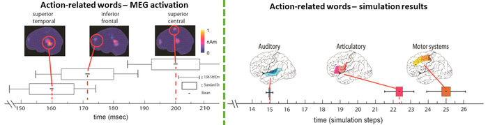 The MatCo project addresses these issues by building neural networks of a specific kind. These brain-constrained networks implement a range of structural and functional features of real brains, so that, for example, specific differences in anatomy of the human and the monkey brains can be directly implemented in the model and the consequence of these differences on network functionality explored. Among the features implemented are local ones addressing neuron function and plasticity, mesoscopic ones addressing connectivity and interaction of local circuits and also macroscopic ones such as area structure, between-area connectivity and large-scale network interaction. Therefore, brain constrained networks realize neurobiological features revealed by anatomical and physiological neuroscience research. These brain-like networks can then be examined in ‘experiments’ probing cognitive functions, which are analog to experiments carried out with human subjects. The resultant observations and their comparison with data from humans may allow for careful conclusions on the neuromechanistic basis of cognition and language.