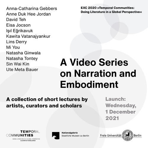 "Narration and Embodiment – A Video Lecture Series" is part of the research transfer project "Circulating Narratives – Entangling Communities: Case Studies in Global Performance Art" in collaboration with Hamburger Bahnhof – Museum für Gegenwart – Berlin. The project is hosted at the international research Cluster of Excellence EXC 2020 “Temporal Communities: Doing Literature in a Global Perspective” at Freie Universität Berlin and accompanies the museum's exhibition "Collecting Entanglements and Embodied Histories", curated by Anna-Catharina Gebbers, Grace Samboh, Gridthiya Gaweewong and June Yap, funded by the Kulturstiftung des Bundes and initiated by the Goethe-Institut, which will open in November 2021 in Berlin. The video lecture series is organised by Siobhan Leddy and Lieselotte Schinzing and will be published online on 1 December 2021 on the Cluster's website and its YouTube channel.