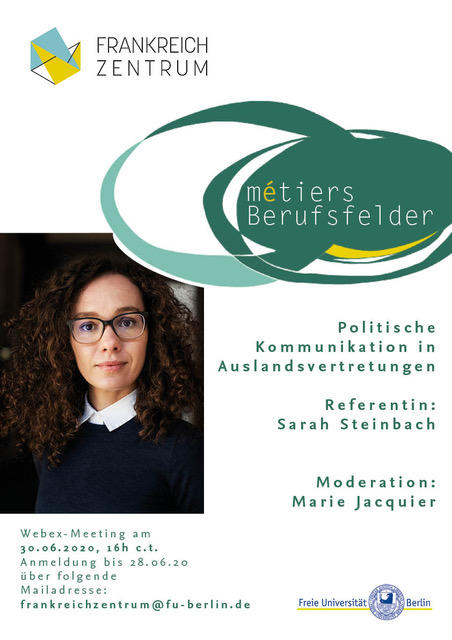 Die Reihe métiers | Berufsfelder des Frankreichzentrums widmet sich Studienbiographien und Werdegängen von Referent*innen verschiedener Horizonte, möchte gemeinsam mit Studierenden Berufswege nachzuvollziehen und damit verbundene Berufsfelder so konkret wie möglich präsentieren. Bislang wurden Wege in den (dt.-frz.) Journalismus aufgezeigt (Prof. Dr. Jürgen Ritte, SoSe 2019) und das Berufsfeld der Verlagslektorin (Sabine Erbrich, WS 2019/20) diskutiert. In diesem Digitalsemester haben wir über Videokonferenz mit Sarah Steinbach, einer Alumna des Instituts für Romanische Philologie und langjährigen Mitarbeiterin der Französischen Botschaft über ihren Werdegang gesprochen.