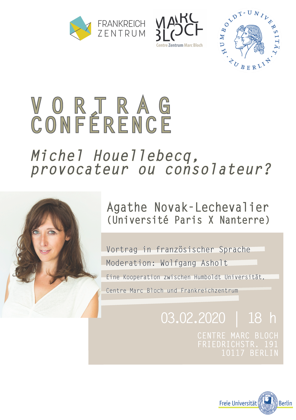 Agathe Novak-Lechevalier ist spätestens seit ihrem Houellebecq gewidmeten Cahier de l'Herne und dem Essay Michel Houellebecq, l'art de la consolation die ausgewiesenste Houellebecq-Kennerin. Ihr Vortrag wird die gängigen Houellebecq-Bilder infrage stellen und bietet die Chance, einen "neuen" Houellebecq kennenzulernen.