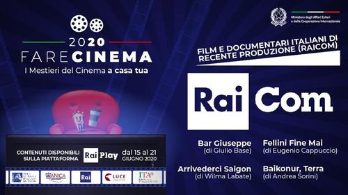 Per #FareCinema su RaiPlay una raccolta esclusiva Rai Com di film e documentari italiani di recente produzione, disponibili gratuitamente e per l'occasione fruibili in tutto il mondo dal 15 al 21 giugno: "Bar Giuseppe" di Giulio Base, "Arrivederci Saigon" di Wilma Labate, "Fellini Fine Mai" di Eugenio Cappuccio, "Baikonur, Terra" di Andrea Sorini.