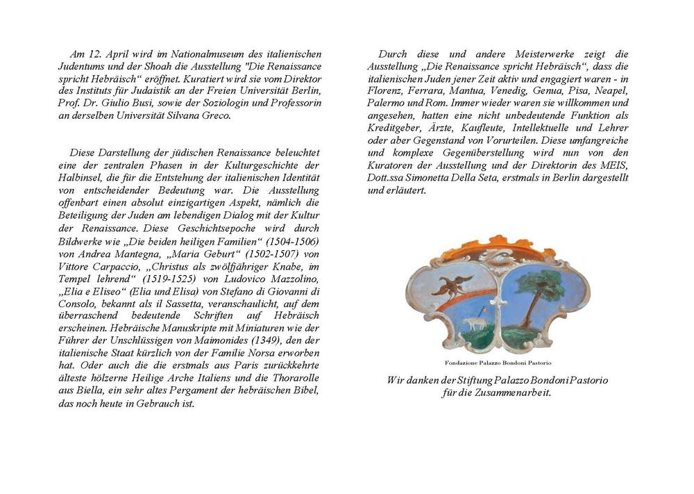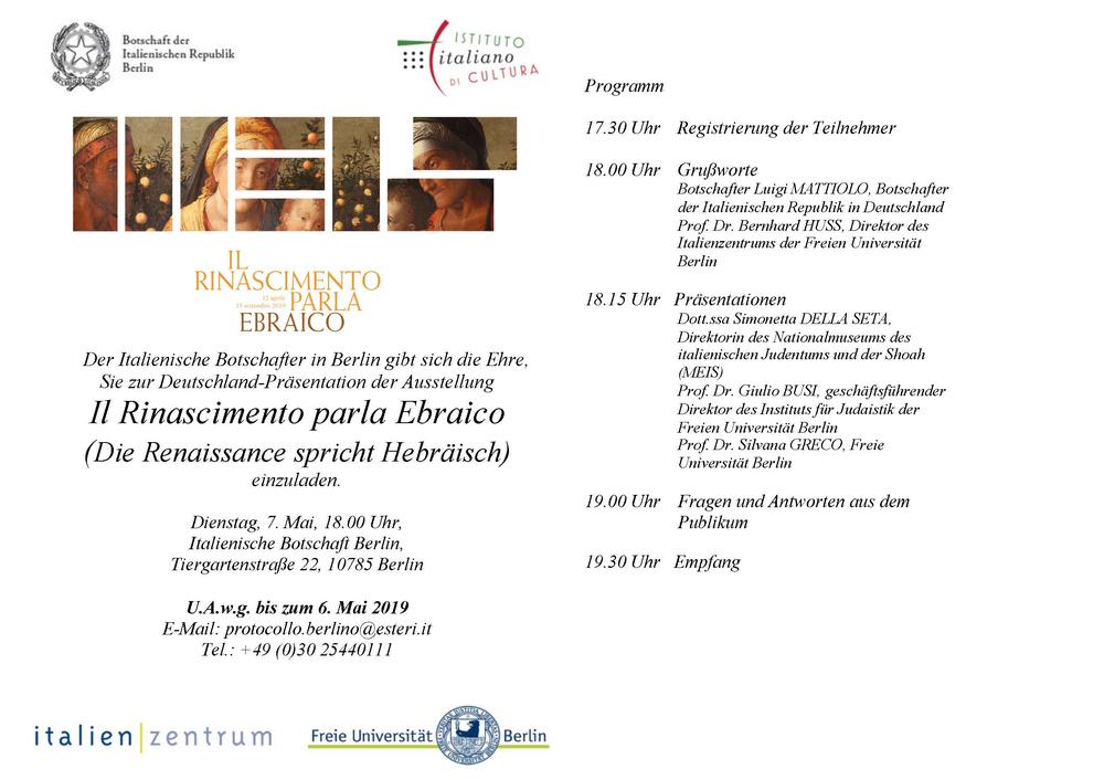 Presentazione della mostra Il Rinascimento parla ebraico (12.04. - 15.09.2019) del Museo Nazionale dell'Ebraismo Italiano e della Shoah (MEIS) a Ferrara con la direttrice del MEIS, Simonetta della Seta, e i curatori della mostra, Prof. Dr. Giulio Busi e Prof. Dr. Silvana Greco (Freie Universität Berlin)
