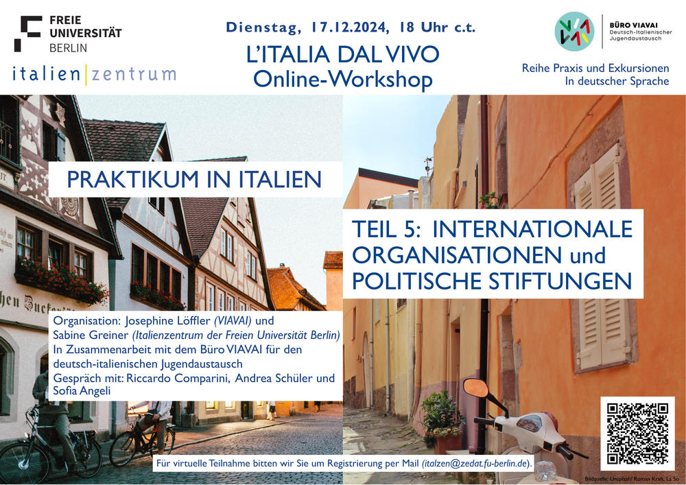 "L'italia dal vivo - Tirocinio in Italia" è una serie di eventi online che affronta queste domande. e permette agli ex stagisti di dire la loro. La serie è organizzata dal della Freie Universitätdi Berlino e dall'ufficio VIAVAI per lo scambio giovanile italo-tedesco. Le testimonianze di ex stagisti racconteranno le loro esperienze individuali, daranno una visione più approfondita dei rispettivi settori di lavoro e saranno disponibili a rispondere alle domande del pubblico. I workshop sono rivolti principalmente agli studenti in Germania che stanno acquisendo o hanno già una conoscenza della lingua italiana e/o che hanno hanno contatti con l'Italia nel loro percorso di loro studi e vorrebbero fare uno stage in Italia.