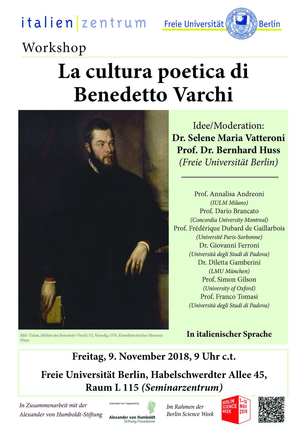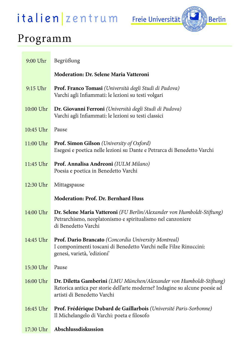 | 14:00 Uhr | Dr. Selene Maria Vatteroni (Freie Universität Berlin/Alexander von Humboldt-Stiftung) Petrarchismo, neoplatonismo e Spiritualismo nel canzoniere di Benedetto Varchi |