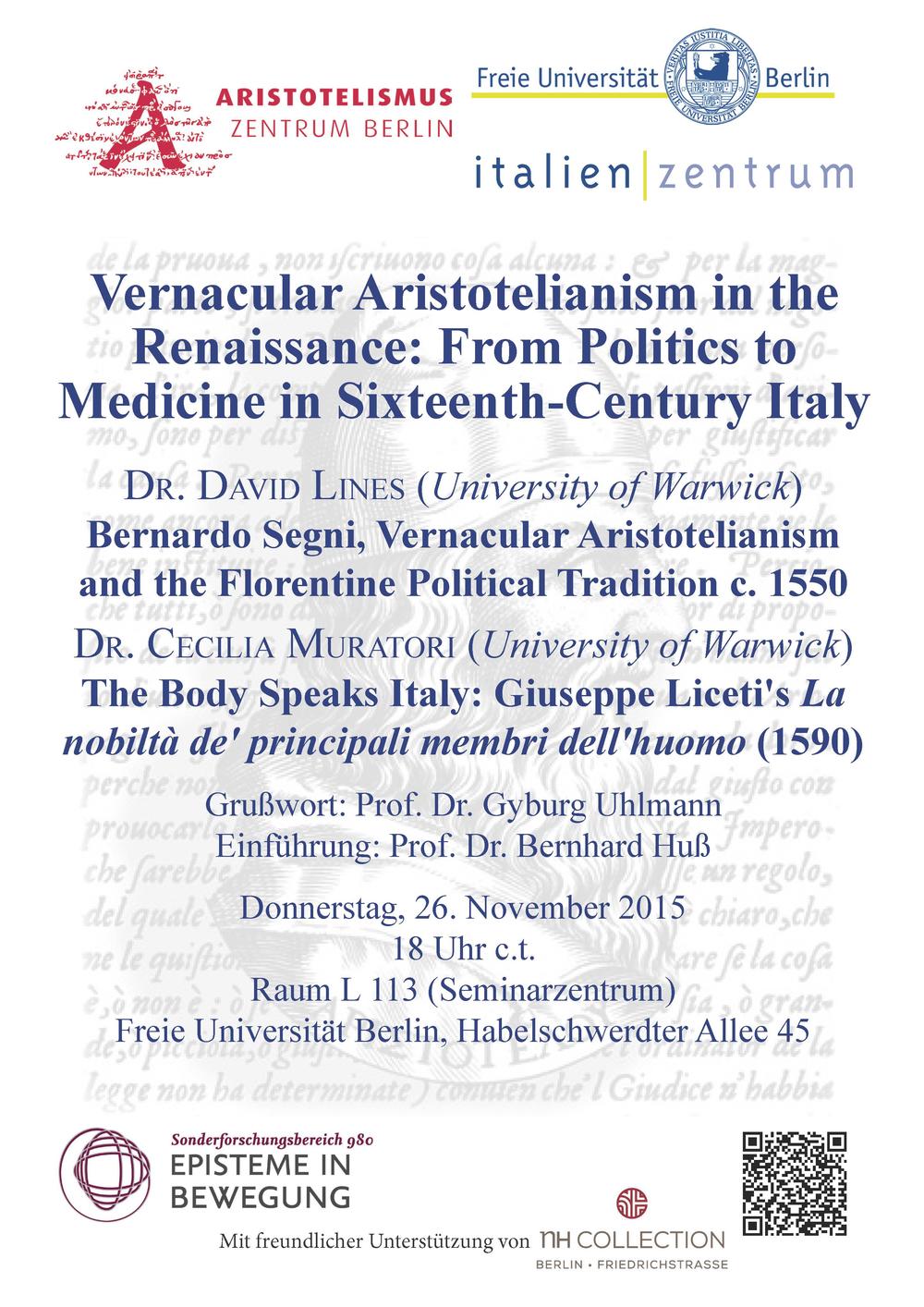 Interventi del Dr. David Lines (University of Warwick) e della Dr. Cecilia Muratori (University of Warwick): Vernacular Aristotelianism in the Renaissance: From Politics to Medicine in Sixteenth-Century Italy
