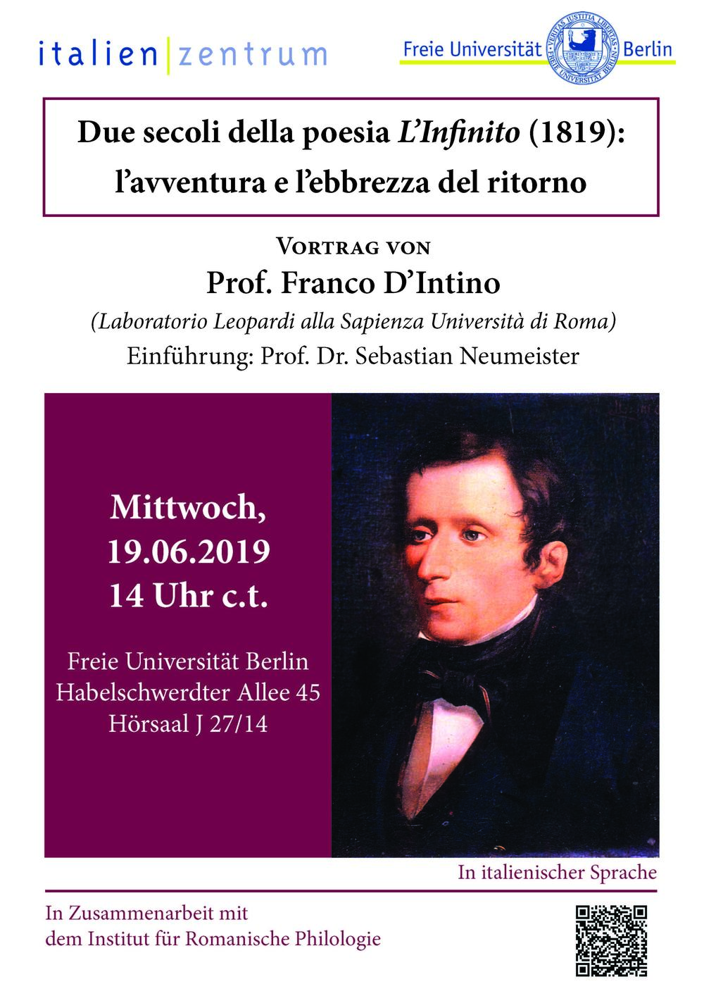 Due secoli della poesia "L'Infinito" (1819): l'avventura e l'ebbrezza del ritorno. Vortrag von Prof. Franco D'Intino (Laboratorio Leopardi alla Sapienza Università di Roma)