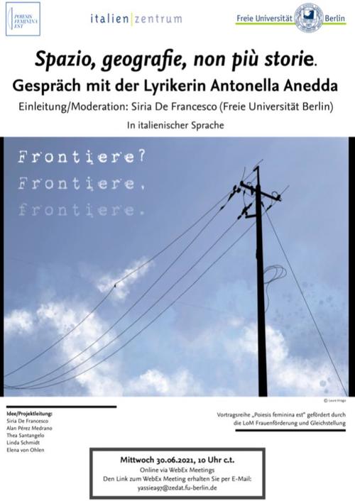 Das Treffen mit der Dichterin Antonella Anedda ist Teil der Veranstaltungsreihe "Poiesis feminina est" des Bildungsprojekts "Gender und Diversity in der Lehre: Weibliche Stimmen der romanischen Lyrik im 20. und 21. Jh.", gefördert durch die Frauenförderung und Gleichstellung des Fachbereichs Philosophie und Geisteswissenschaften der Freien Universität Berlin. Das Interview mit der Autorin wird in Zusammenarbeit mit dem Italienzentrum der Freien Universität Berlin im Rahmen des Seminars "Voci di donne nella poesia italiana dagli anni Settanta ad oggi" organisiert und richtet sich an ein Publikum von Studenten und Beteiligten zur zeitgenössischen Poesie.