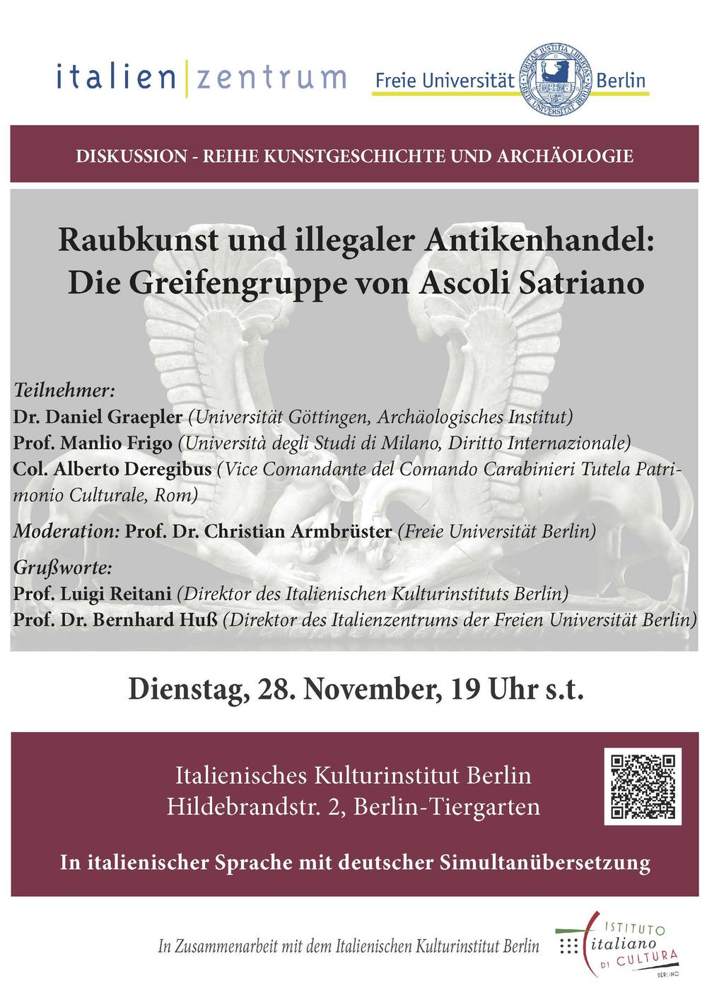 Dr. Daniel Graepler (Universität Göttingen, Archäologisches Institut), Prof. Manlio Frigo (Università degli Studi di Milano, Diritto Internazionale), Col. Alberto Deregibus (Vice Comandante del Comando Carabinieri Tutela Patrimonio Culturale, Rom)