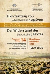 Das Institut für Griechische und Lateinische Philologie der Freien Universität Berlin, Professur Neogräzistik, und das Zentrum für die Griechische Sprache (ZGS) laden Sie herzlich ein am Freitag, den 14. November 2008 zur Tagung Der Widerstand des (literarischen) Textes: Deutsch-Griechische / Griechisch-Deutsche Übersetzungspraxis.