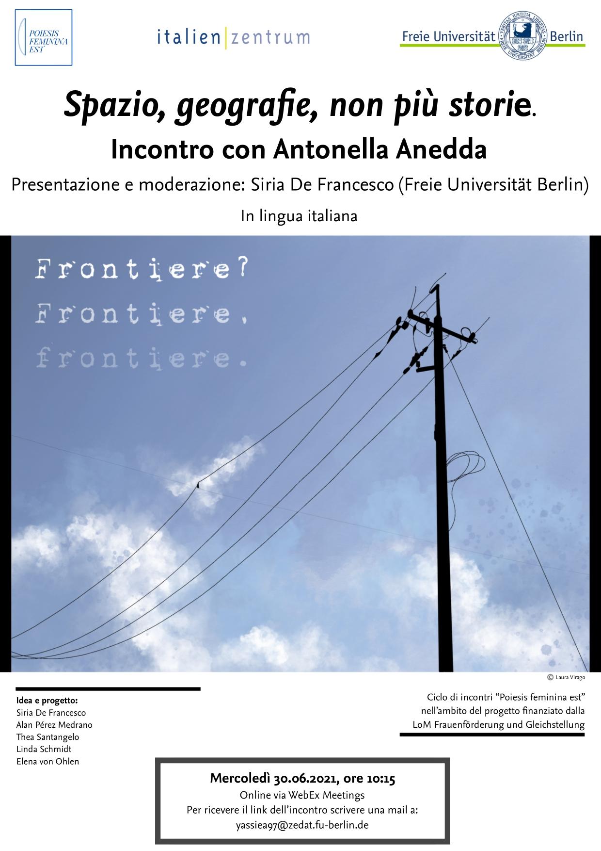 WebEx Meetings | an Online-Veranstaltung teilnehmen → ab 30.06.2021, 10 Uhr s.t.Antonella Anedda Angioy: (Roma, Italien, *1955) ist Dichterin, Essayistin und Übersetzerin. Sie hat vom Band Residenze invernali (Crocetti 1992) bis zu den neuen Historiae (Einaudi 2018) große kritische und öffentliche Erfolge erzielt und sich als eine der wichtigsten Stimmen in der aktuellen poetischen Szene etabliert. Mit zahlreichen Preisen ausgezeichnet, erhielt sie im Jahr 2000 den Premio internazionale Montale für Notti di pace occidentale (Donzelli 1999) und 2012 den Premio Viareggio für die Salva con nome Sammlung (Mondadori 2012). Ihre Übersetzungen klassischer und moderner Dichter von Ovid bis Philippe Jaccottet und Anne Carson sind im Band Nomi distanti (Empiria 2006) zusammengefasst. Eine englischsprachige Anthologie, Archipelago, wurde 2014 für Bloodaxe hrsg. vom Dichter Jamie McKendrick veröffentlicht und mit dem Premio John Florio für Übersetzung ausgezeichnet. 2019 erhielt sie den Premio Tirinnanzi für ihr Lebenswerk und eine Ehrendoktorwürde für ihre literarische Arbeit an der Universität Sorbonne (Paris IV). In diesem Jahr wurde der Band Geografie bei Garzanti veröffentlicht, und für die Arten von Chiarelettere das Buch Poesie come ossigeno. Per un'ecologia della parola in Zusammenarbeit mit Elisa Biagini und hrsg. von Riccardo Donati.